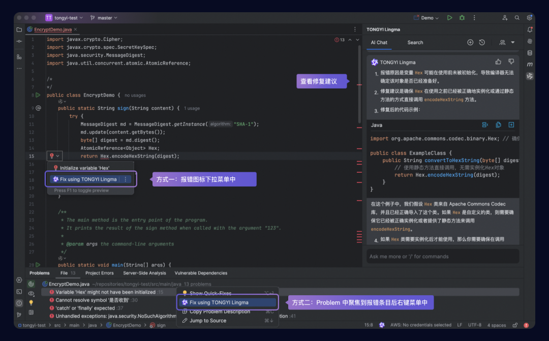 当您编码遇到问题,缺乏具体解决思路时,可单击 IDE 侧边工具导航或使用⌘ ⇧ L唤起通义灵码智能问答助手,无需离开 IDE 客户端,即可快速获得答案和解决思路。