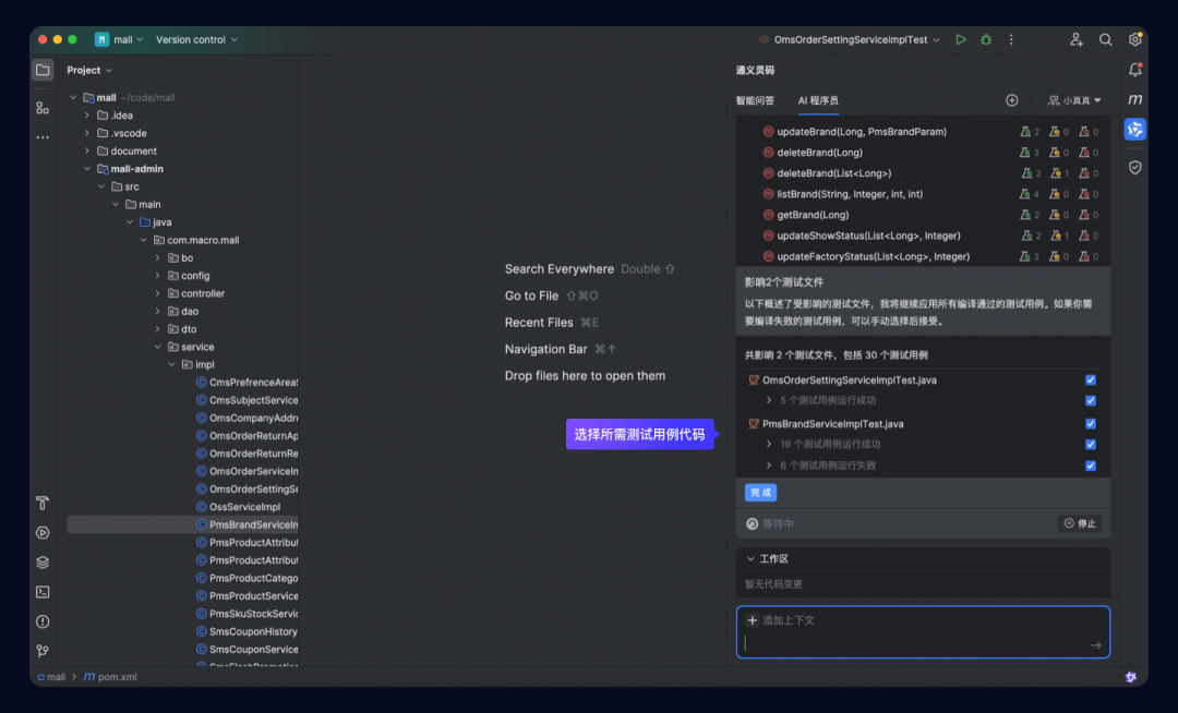 当所有方法的用例生成完成后,AI 程序员自动将编译通过和运行通过的用例合并成最终测试用例文件,并根据被测文件自动进行命名。对于编译失败的测试用例代码,开发者可自行选择是否需要,所有用例代码确认后,可单击完成按钮,测试用例文件将自动与原测试用例文件进行差异对比。