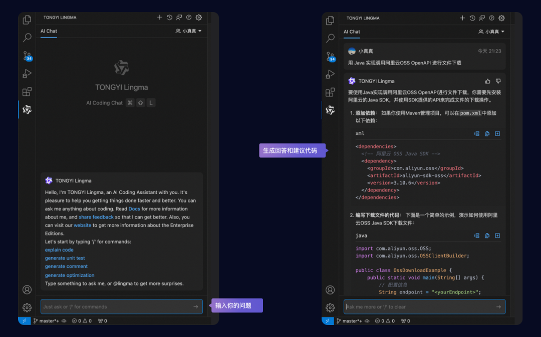 同时,通义灵码提供了相关的交互界面帮助开发者与 AI 程序员进行对话和交互,整体交互界面区域如下: