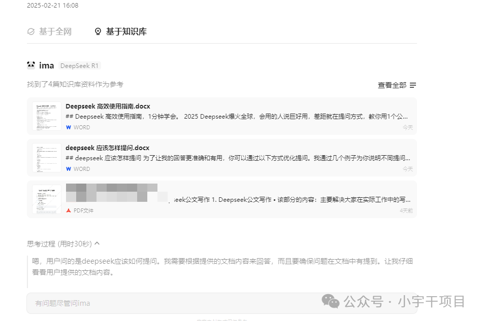 ima大致的工作流程是先理解我的问题,然后从我的知识库中搜索跟问题相关的内容。找到之后再通过大模型深度思考回答。