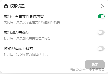 默认打开,所有成员可以看见共享知识库里面的全部内容,关闭后,成员则无法查看。