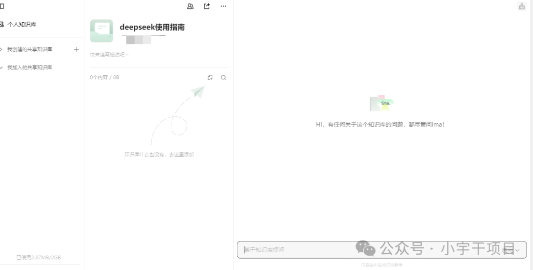 知识库分为【个人知识库】和【共享知识库】两种。也就是说我们可以搭建自己知识库的同时,也可以加入其他人共享的知识库。