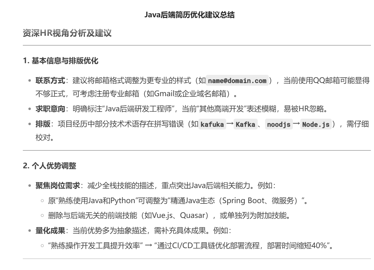 由于涉及隐私问题,我就不展示效果图了。说实在的,AI 生成的内容有时会比较夸张。大家可以根据自身实际情况有选择地修改。要是觉得内容太吹嘘了,也可以在提示词里注明 “太吹了,改得真实点” 。或者自己先动手改改,然后再交给 AI 接着完善。像基础格式这类工作,交给 AI 来处理完全没问题。总之,就是要反复优化自己的简历。