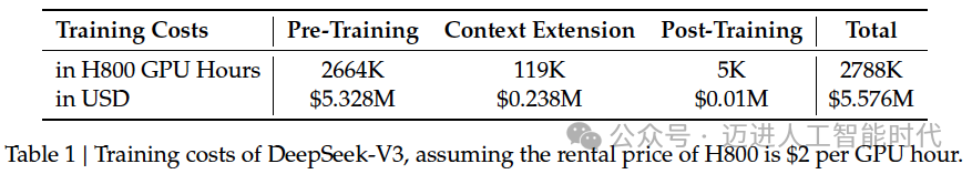 下表展示了每个阶段所用的GPU Hours。95%的训练时间和成本是在第一个阶段:预训练。后训练只有5千GPU小时,按他们宣传的2k GPU计算,大约只有2个半小时。后面会介绍,就是这2.5小时,对V3惊艳的效果起到了决定性作用。