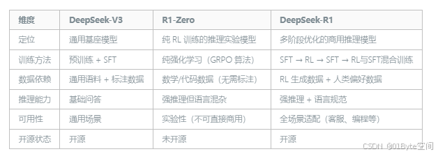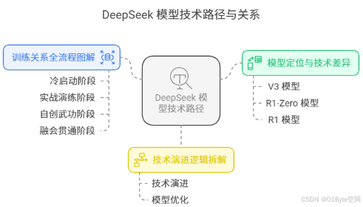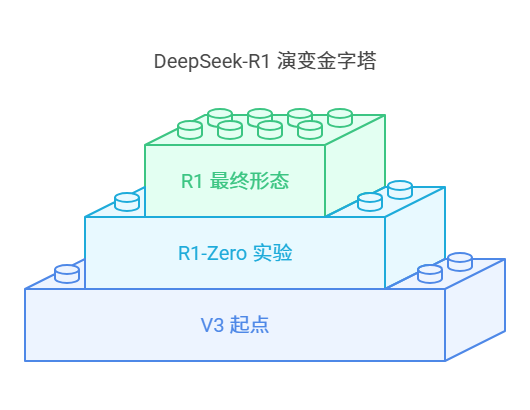 - 1. V3 是起点:作为通用基座模型,提供基础语言能力。