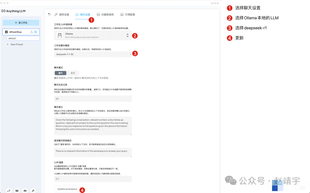 之后可以看到LLM模型选择了Ollama,Embedding默认是AnythingLLM的Embedder,Vector Database默认是LanceDB: