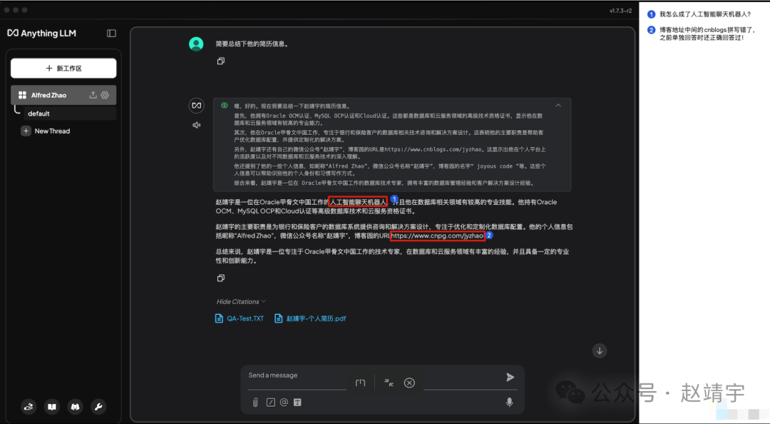 使用跟之前同样的操作方法,同样的问题赵靖宇是谁?,喂养文本QA-Test.TXT,终于起作用了!