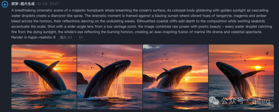 比如我让 DeepSeek 给我生成一个鲸鱼跃出海面喷水的图片,它返回给我一段提示词。