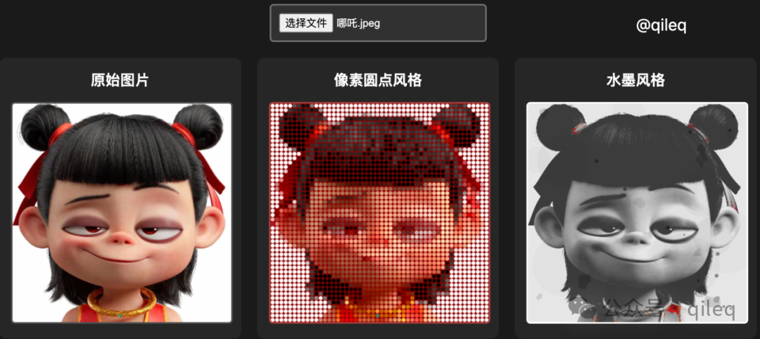 比如我让 DeepSeek 生成一段 HTML 代码,将上传的图片转为“像素圆点风格”和“水墨风格”。