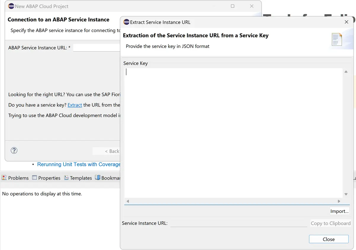 一种方法是直接指定要登录的 ABAP Service Instance URL(下图图例1),另一种方法是导入一个 JSON 格式的 Service Key 文件(下图图例2)。