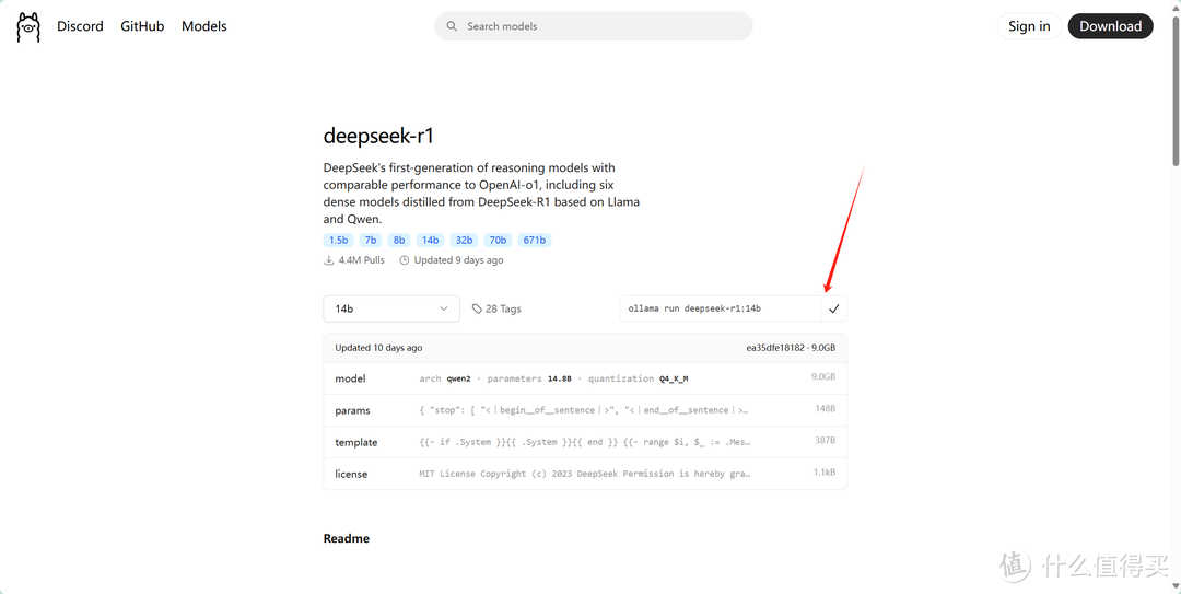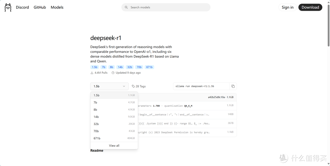 点击 Deepseek-r1 后会进入详情界面,里面有多个参数规模可供选择,从 1.5b 到 671b 都有。