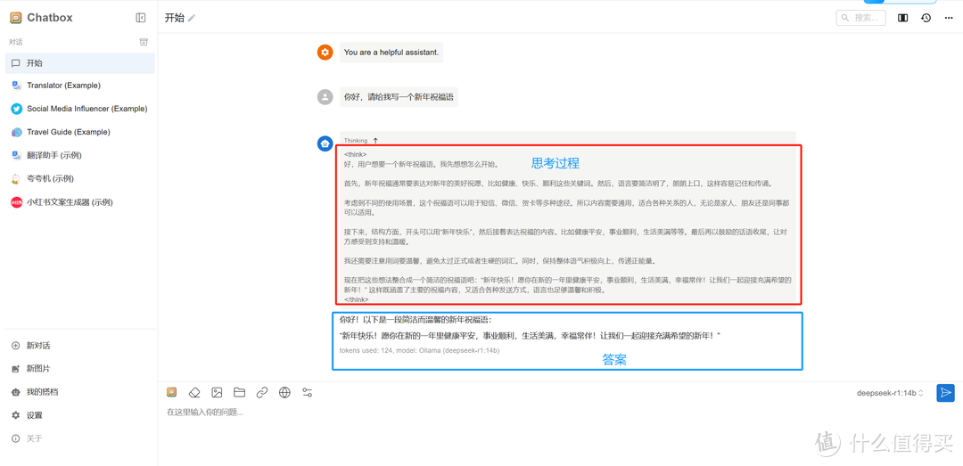 接下来只需要在 Chatbox 中新建对话即可使用 Deepseek 模型了,以下图为例,上方是它的思考过程,下方是它给出的答案。