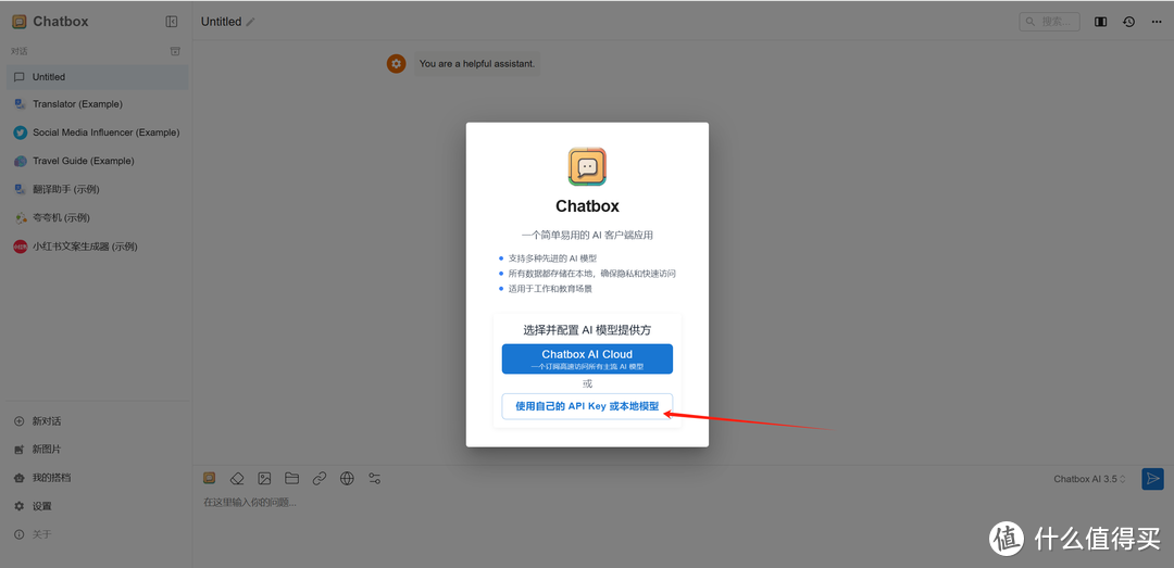 我这边直接使用网页版,进入 Chatbox 网页版本后点击使用自己的 API Key 或本地模型。