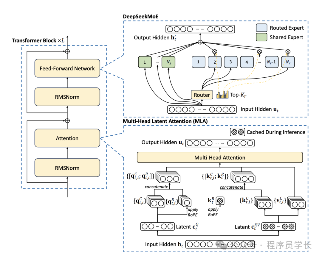 对 KV(Key & Value)进行低秩压缩,只存储一个小的潜在向量 ,在需要时再恢复 Key 和 Value,极大地减少 KV 缓存大小。