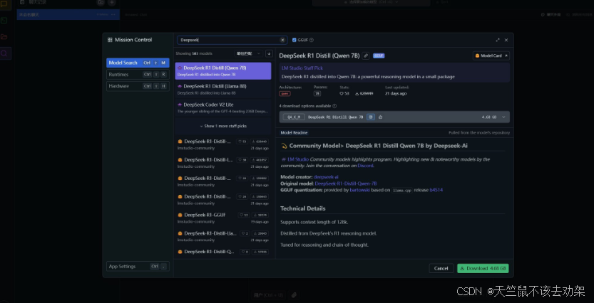 - 在 LM Studio 中搜索下载:在 LM Studio 的设置里,常规部分选中 Use LM Studio's Hugging Face 的复选框,然后点击左上方的搜索图标(放大镜),搜索 deepseek 即可找到各种不同版本的模型。该方式使用简单,但下载可能不太稳定。