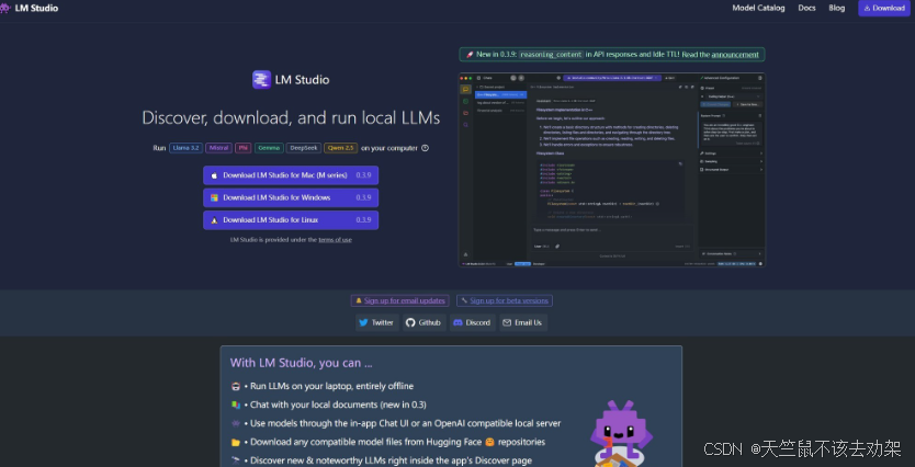 安装 LM Studio 客户端:在官网 lmstudio.ai 下载对应操作系统的安装包,下载完成后双击运行,按照提示完成安装。安装完成后启动 LM Studio。
