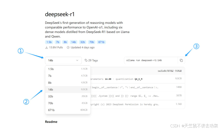 3. 搜索并选择模型:在 Ollama 官网搜索 “deepseek” ,点击 deepseek - r1,会出现多个不同大小的模型版本,根据自己的硬件配置选择合适的模型。