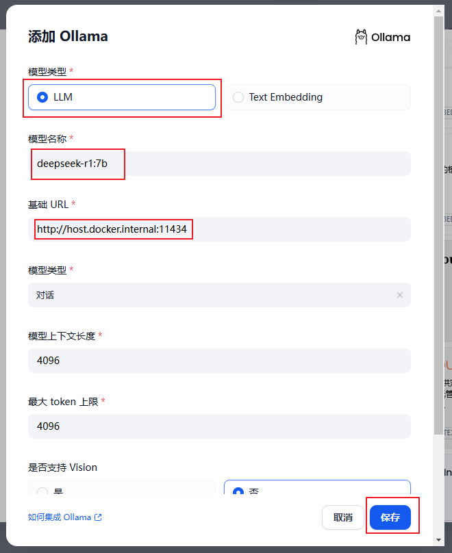 同样的方式,在Ollama下添加模型,参数如下: