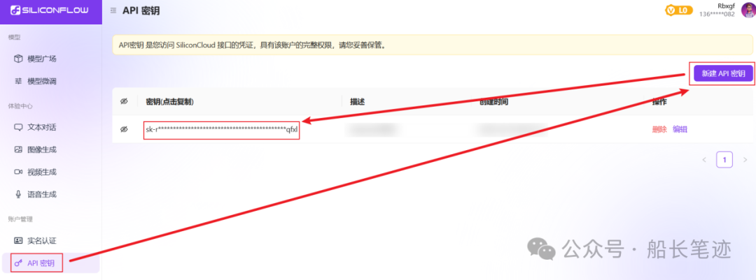 登录后,在左侧菜单列表中点击API密钥,打开配置页面后在右上角点击新建API密钥,弹窗中填写一下描述,确认就会生成一条API密钥信息。
