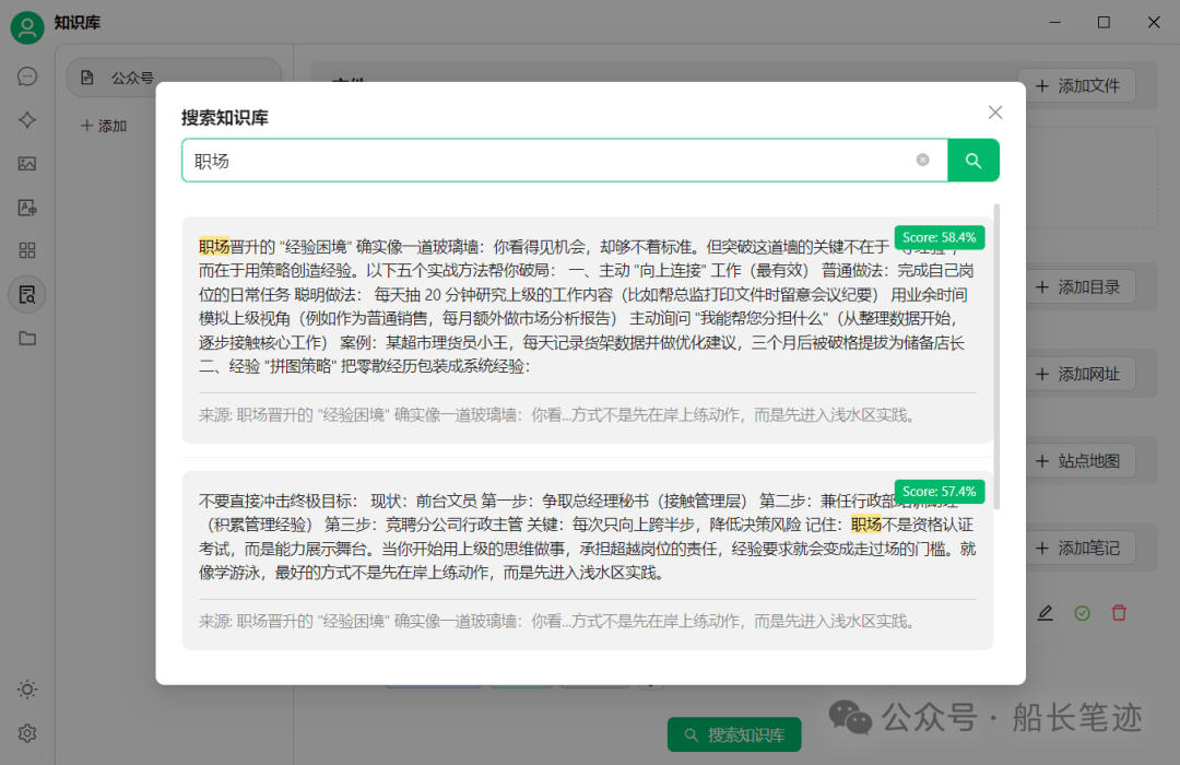 保存后,我们就可以给这个知识库添加各种指定领域的知识信息,文件、网址、笔记等常见信息类型都是可以添加。