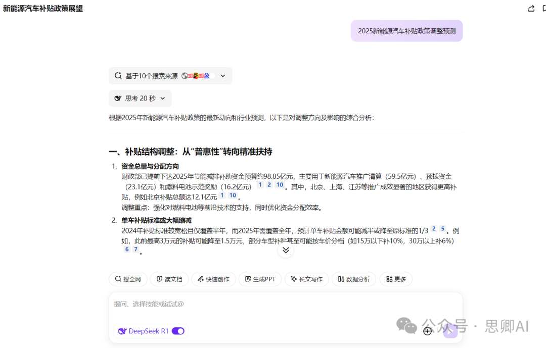 输出效果: AI自动抓取工信部官网、36氪等行业报告,整合出政策调整几大趋势预测(补贴结构调整、以旧换新政策、地方政策差异化等)