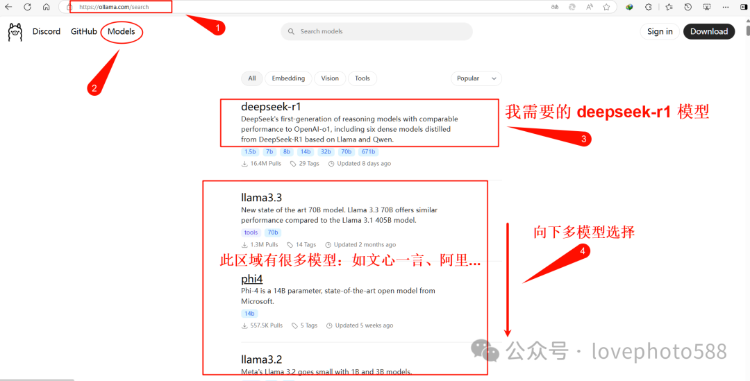 1、点击“模型”地址后进入模型第一个就是deepseek-r1模型,如不显示则在上方搜索框输入:“deepseek-r1”进行搜索即可。