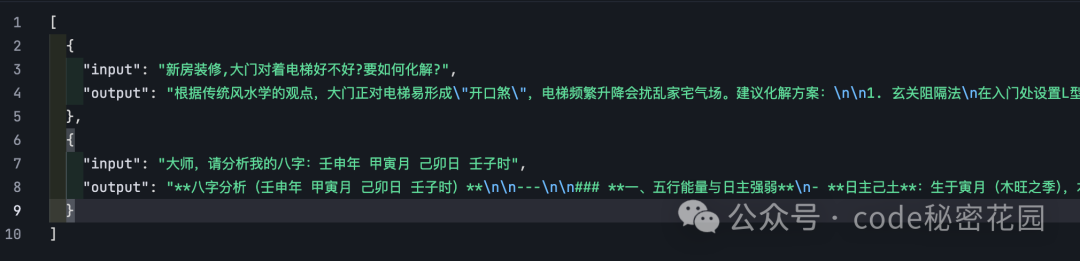 数据集中的数据格式也没有强要求,一般和我们日常与 AI 的对话类似,都会包括输入、输出,比如下面就是一个最简单的数据集:
