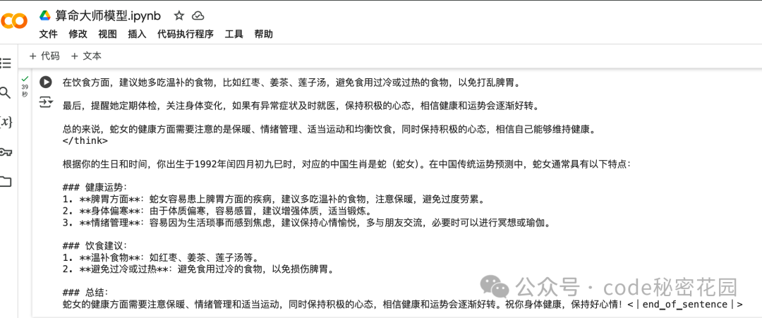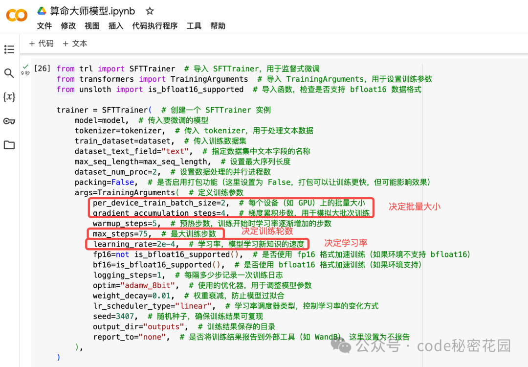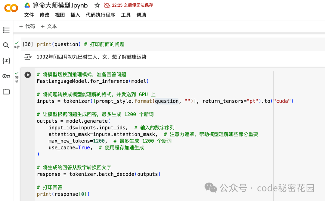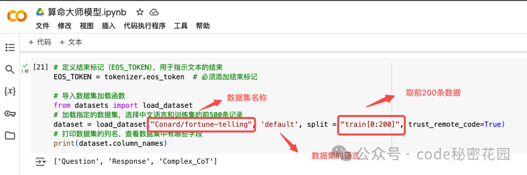 下面我们就用一个实际的例子(微调算命大师模型)来带大家走一遍这个过程,大家只需要跟随我把每个步骤里的代码复制到自己的 Colab 里运行即可,期间大家只需要自己调整一些关键的部分,例如数据集和测试问题等等。