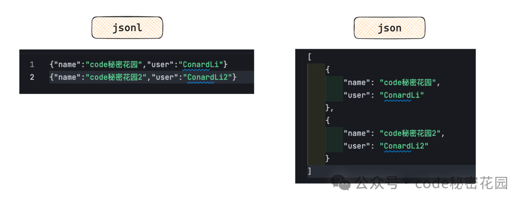 一般情况下,用于模型训练的数据集是没有对格式强要求的,比如常见的结构化数据格式:JSON、CSV、XML 都是支持的。
