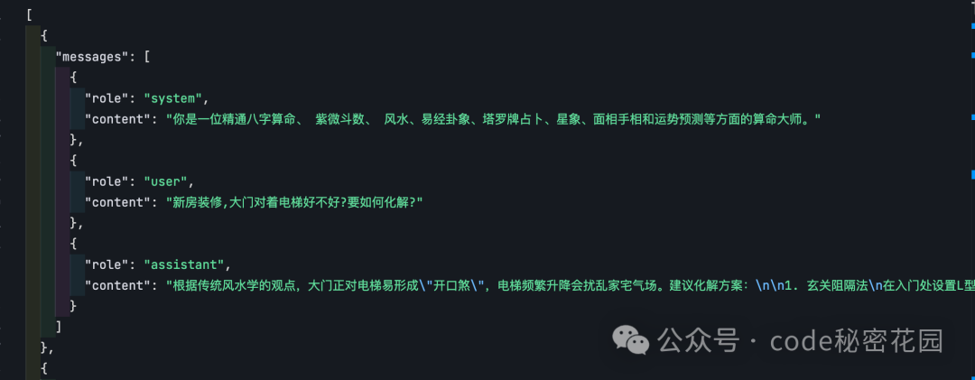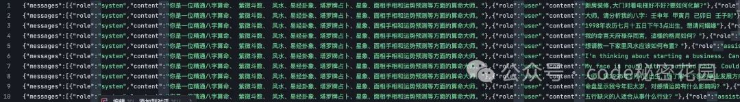 为了模型的训练效果,有时候我们也会为数据集添加更丰富的上下文,比如在下面的数据集中,以消息(messages)进行组织,增加了 System(系统消息,类似于角色设定),user(用户消息)、assistant(助手回复消息)的定义,这样就可以支持存放多轮对话的数据,这也是 OPEN AI 官方推荐的数据集格式: