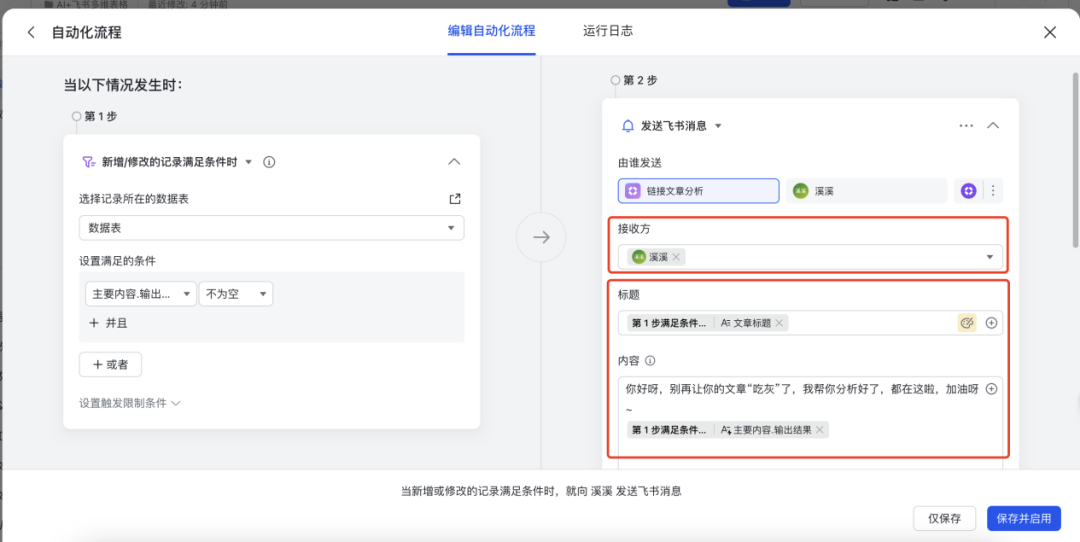 所以,在右侧第二步的位置,把我们自己配置在接收方,标题和内容分别取表格中“文章标题”列和“输出结果”列,如下图所示。