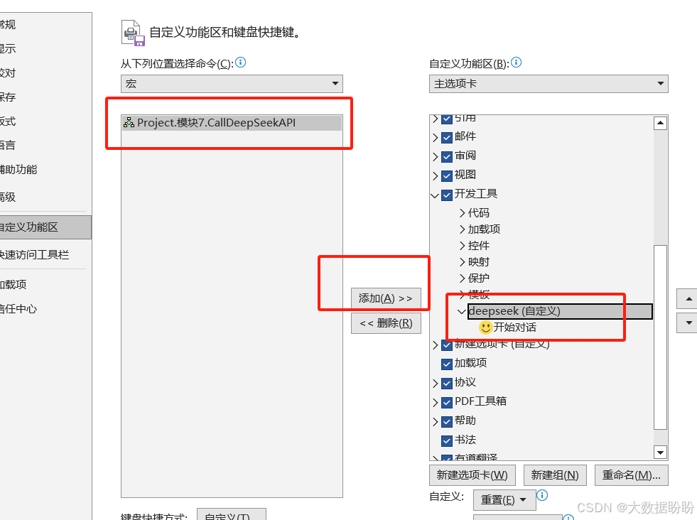 5.保存VB脚本并关闭窗口;再依次点击:【文件】>【更多...】>【选项】>【自定义功能区】,选择这里的“宏”,即可看到刚才创建的宏命令。