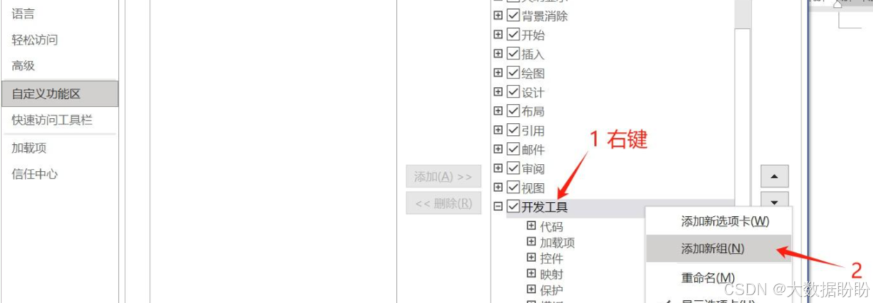 - 在右侧继续右键【开发工具】,在它下面【添加新组】,并可重命名这个组。