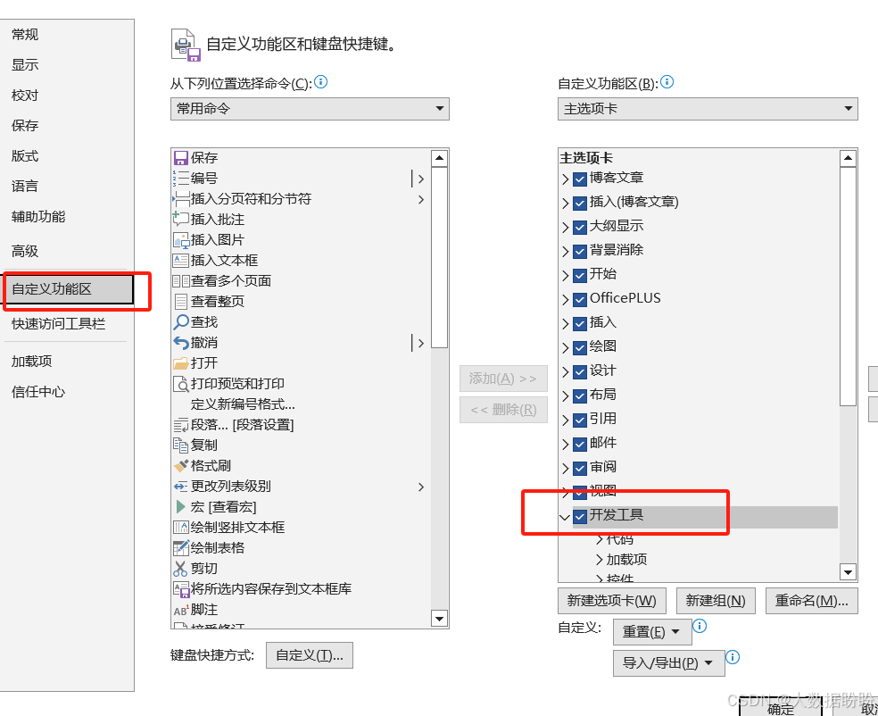 打开Word文档,依次点击:【文件】>【更多...】>【选项】>【自定义功能区】,勾选【开发工具】。