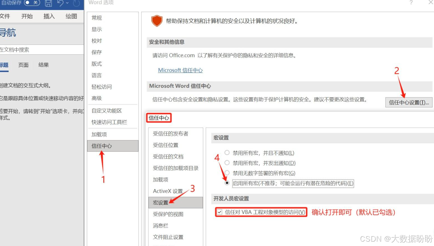 按如下操作启用宏命令:【文件】>【更多...】>【选项】>【信任中心】>【信任中心设置】>【宏设置】,点选【启用所有宏】。