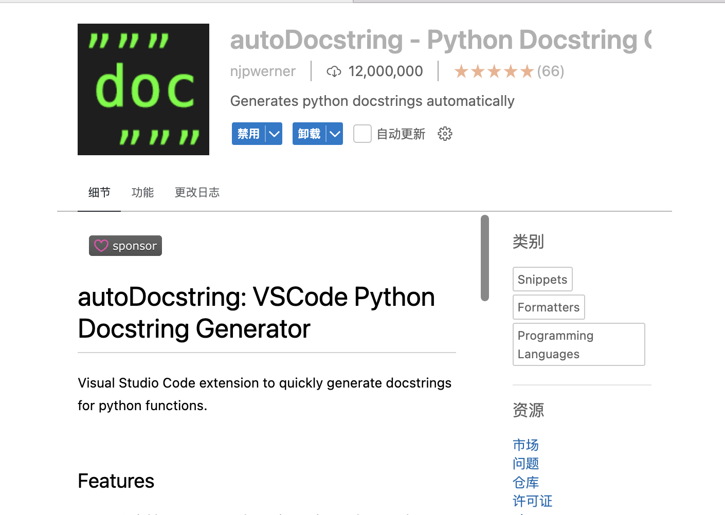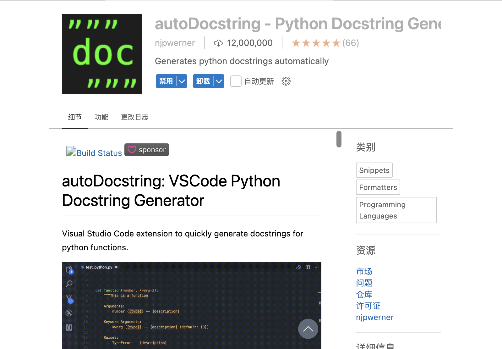 Python Docstring Generator可以自动创建docstring,这真的为开发人员减少了的很大工作量。并且,生成的文档字符串遵循所有标准格式,包括Google、docBlockr、Numpy、Sphinx和PEP0257。它的主要功能包括: