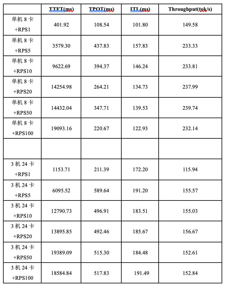 单机部署的TPOT和ITL均显著小于多机部署,吞吐量Throughput则大于多机部署,说明多机部署存在的通信瓶颈会显著影响吞吐量等使用体验;