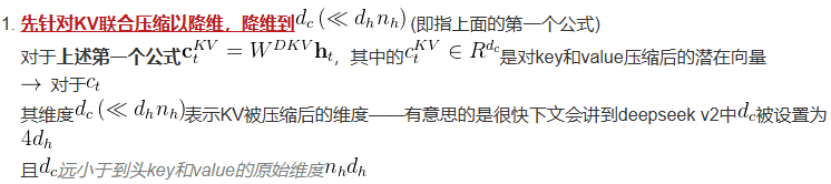 对Key和Value进行了一个低秩联合压缩(即Low-Rank Key-Value Joint Compression,通过低秩转换为一个压缩的KV,使得存储的KV的维度显著减小)