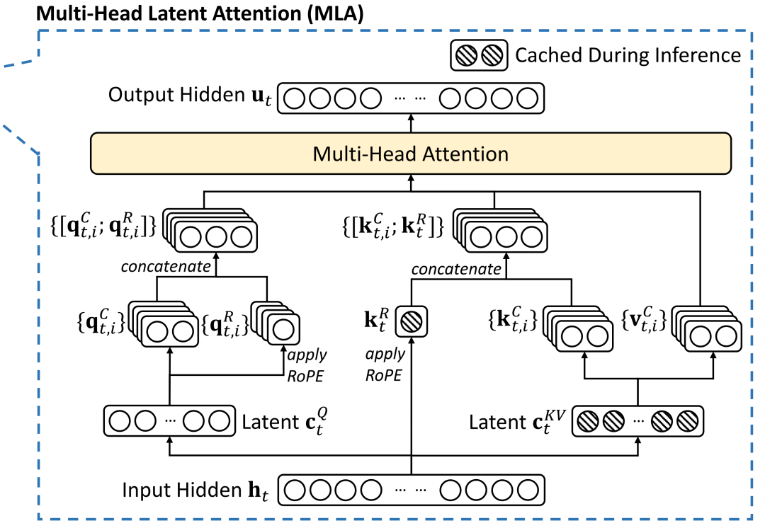 其通过创造性的提出多头潜在注意力:Multi-head Latent Attention(简称MLA),替代传统多头注意力(Multi Head Attention)