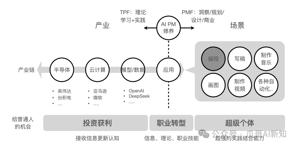 对应以上AI产业和场景,AI给普通人“逆天改命”的机会窗口在哪里?三个:投资获利、超级个体、职业转型(后面以AI产品经理为例来说说)