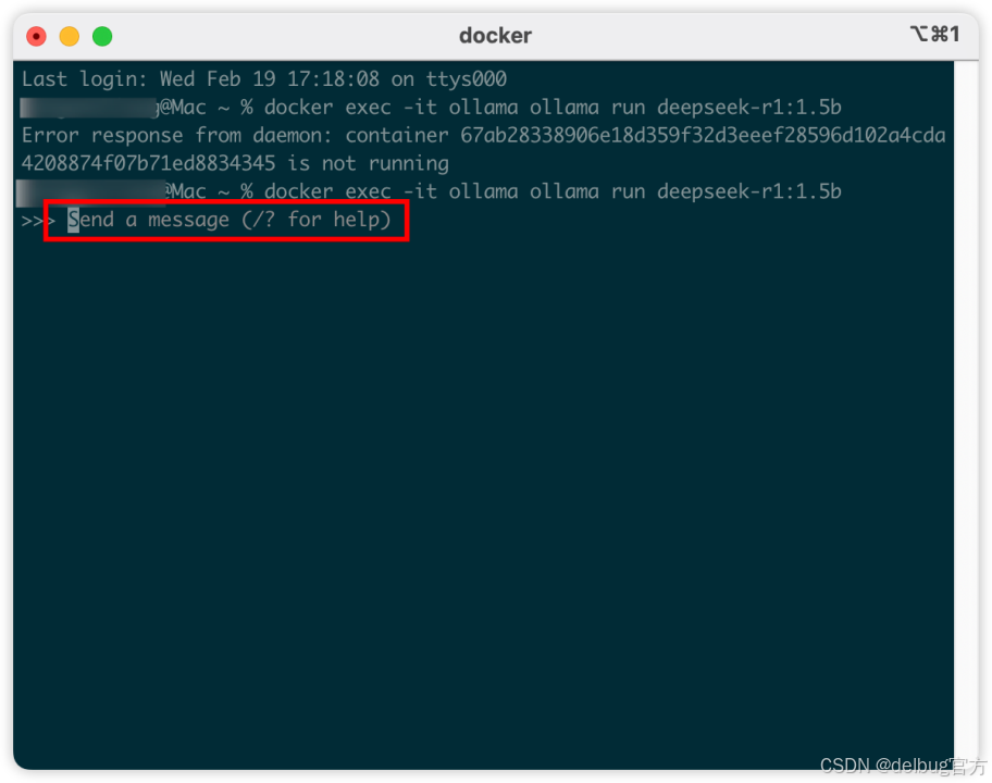 大家在命令行麻溜地输入 “docker exec -it ollama ollama run deepseek - r1:1.5b”,眼睛紧紧盯着屏幕。一旦看到 “>>>Send a message(/? for help)” 出现在眼前,那可就意味着启动成功啦!从这刻起,你就能和 DeepSeek 畅快地对话交流,开启一场超酷的智能交互之旅,冲就完事儿!