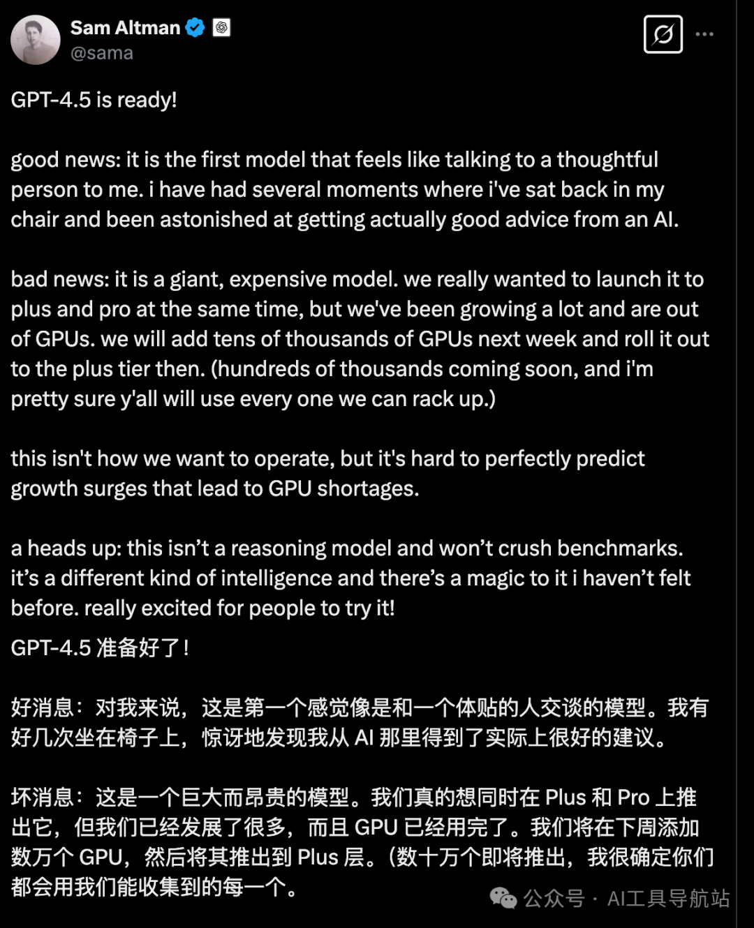 如果大家想要现在马上就使用GPT4.5,可以去订阅Pro会员,不着急的话,可以等下周推放给Plus会员。