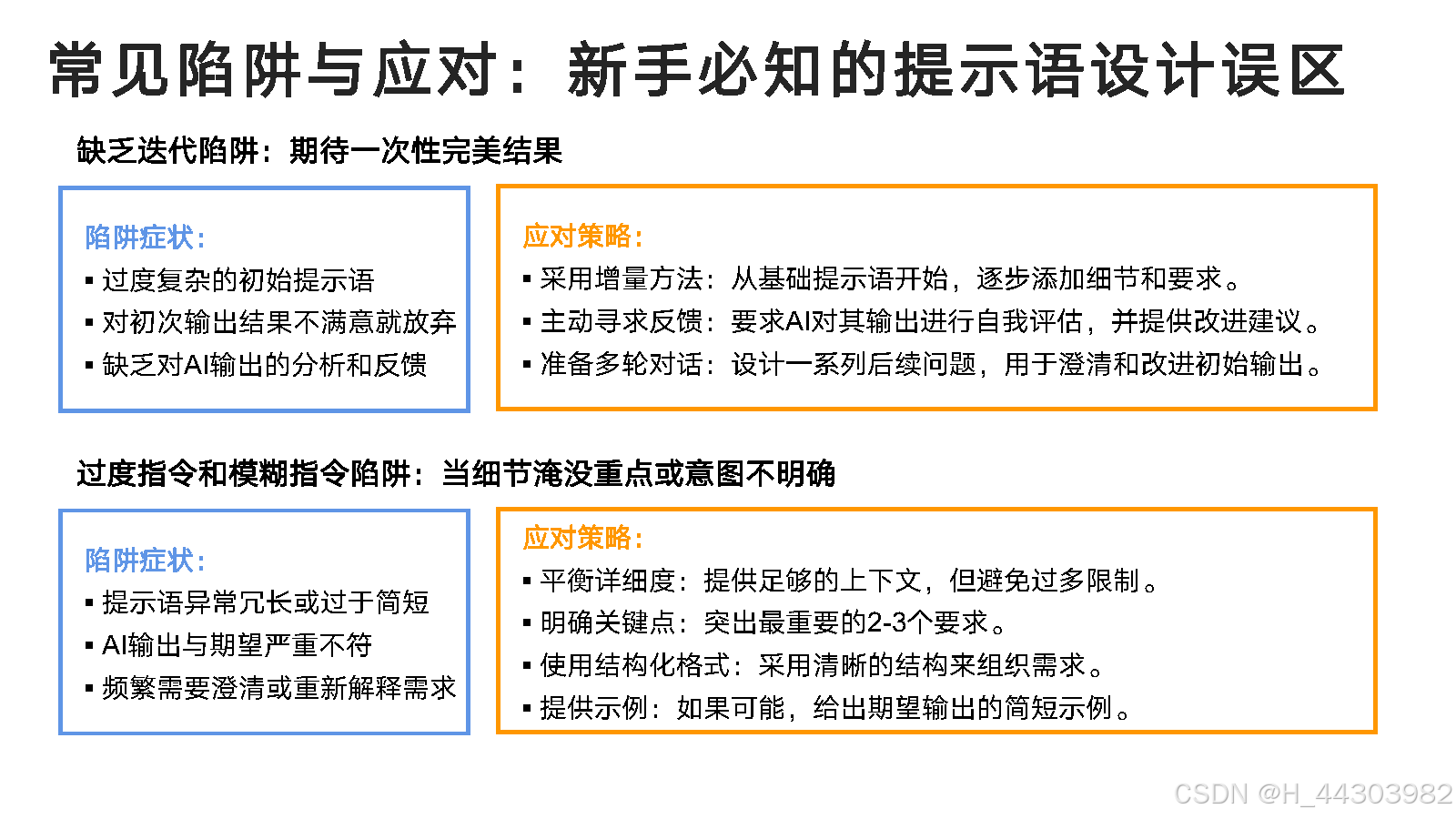 通过今天的讨论,我们学习了如何更有效地与AI对话。我们了解了在设计提示词时可能遇到的一些常见问题,比如缺乏迭代、过度复杂的初始提示语、对初次输出结果不满意就放弃、缺乏对AI输出的分析和反馈、过度指令和模糊指令陷阱。我们还探讨了一些解决策略,比如采用增量方法、主动寻求反馈、准备多轮对话、平衡详细度、明确关键点、使用结构化格式和提供示例。通过这些方法,我们可以提高与AI交流的效率,获得更满意的答案。记
