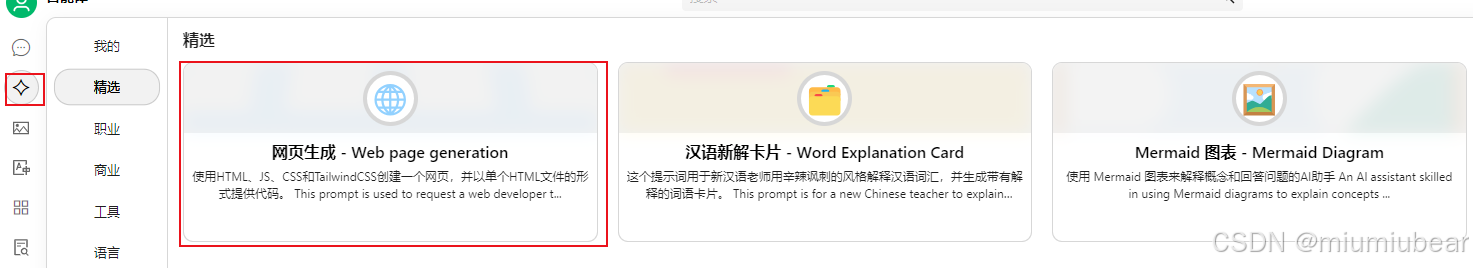 一、打开cherry-studio里面的智能体,选择精选里面的网页生成: