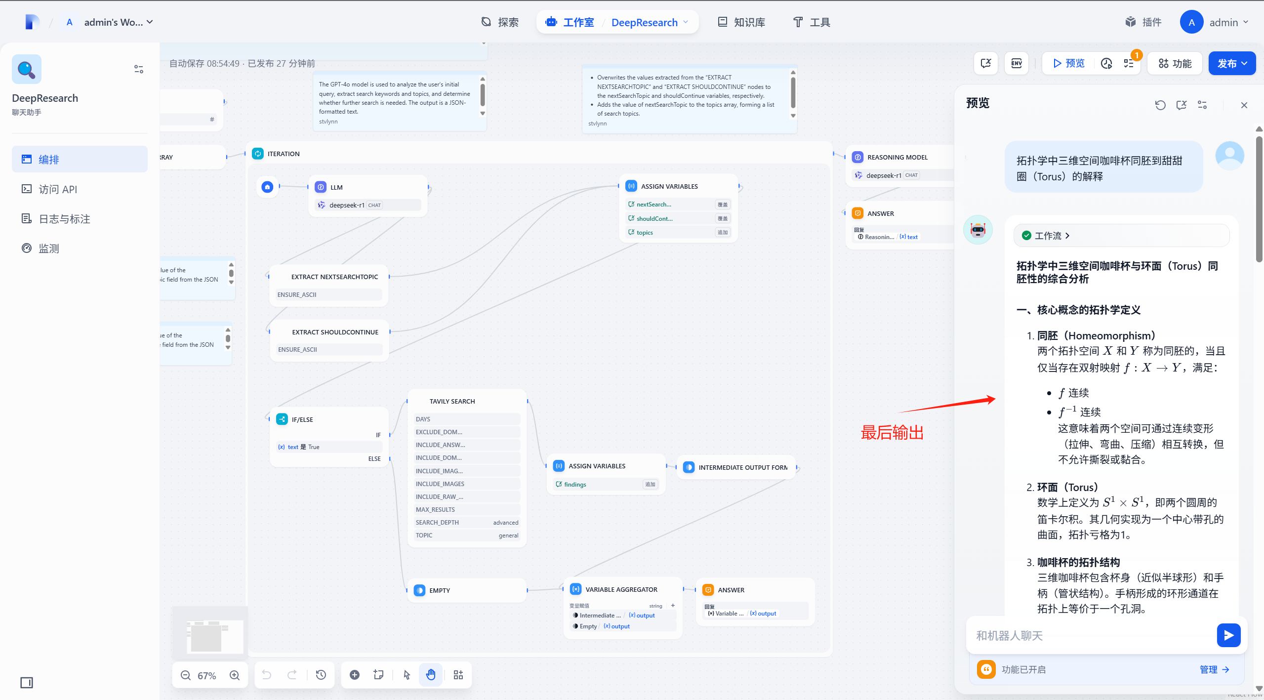 在创建好了之后我们可以看到我们庞大的工作流,这里我们需要修改其中用到的大预言模型为 DeepSeek-R1,我们这里以其中一个作为例子: