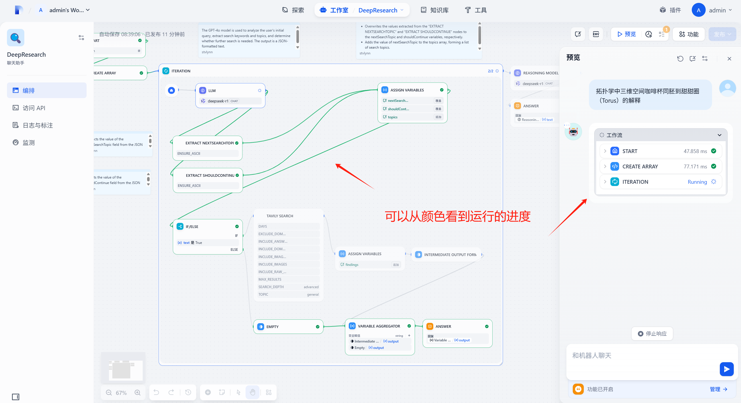 我们可以注意到这里运行还是比较久的,我们也可以在应用的工作流界面中点击【预览】来进行测试,在这个界面进行测试的好处就是工作流中线条会通过改变颜色告诉你目前模型运行到哪一步了: