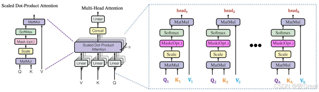 - 多头注意力:多个注意力头并行操作,每个头专注于输入的不同方面。它们的输出被连接并转换,从而实现更丰富的上下文表示。