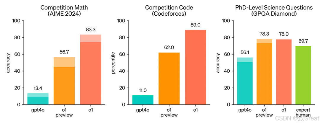 性能:o1-preview在物理、化学和生物学的基准测试中达到了大约博士水平的表现。在美国数学邀请赛中,它解决了83%的问题,相比之下GPT-4o解决了13%。它还在Codeforces编程竞赛中排名在第89百分位。