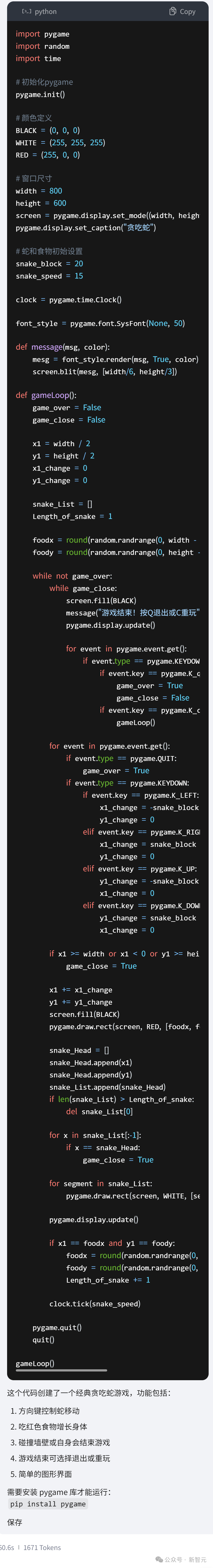 首先让它使用python写一个贪吃蛇小游戏。页面中可以看到DeepSeek-R1的推理过程。