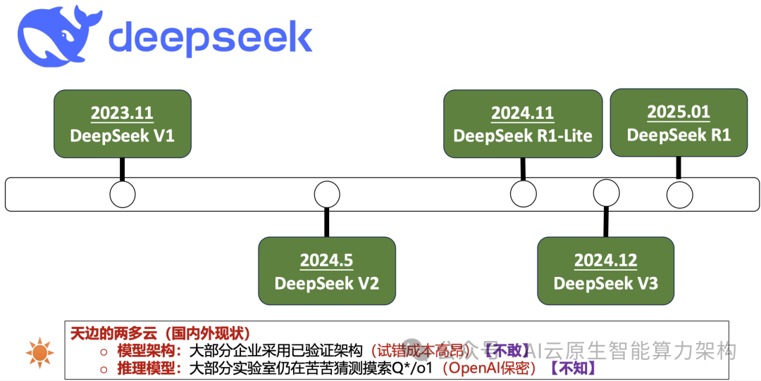 DeepSeek V2-V3及R1在模型架构上选择稀疏MoE模型而非稠密模型,并进行和积 累了大量技术创新,包括MLA、FP8训练、MoE All-to-All通信瓶颈解决、MTP等, 这些技术并不是所有都是原始创新,但是能够进行如此多大模型架构底层创新的实 验室,在全世界可能也只有少数几个。